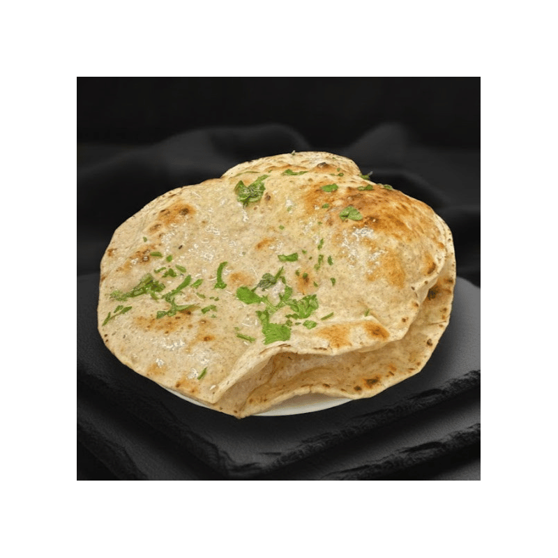 Tandoori Butter Roti Tradycyjny indyjski chlebek z mąki pełnoziarnistej, wypiekany w glinianym piecu Tandoori. Wysoka temperatura nadaje mu charakterystyczną chrupkość i dymny aromat, a wykończenie płynnym masłem sprawia, że jest delikatny i miękki w środku. Idealny dodatek do każdego aromatycznego curry.